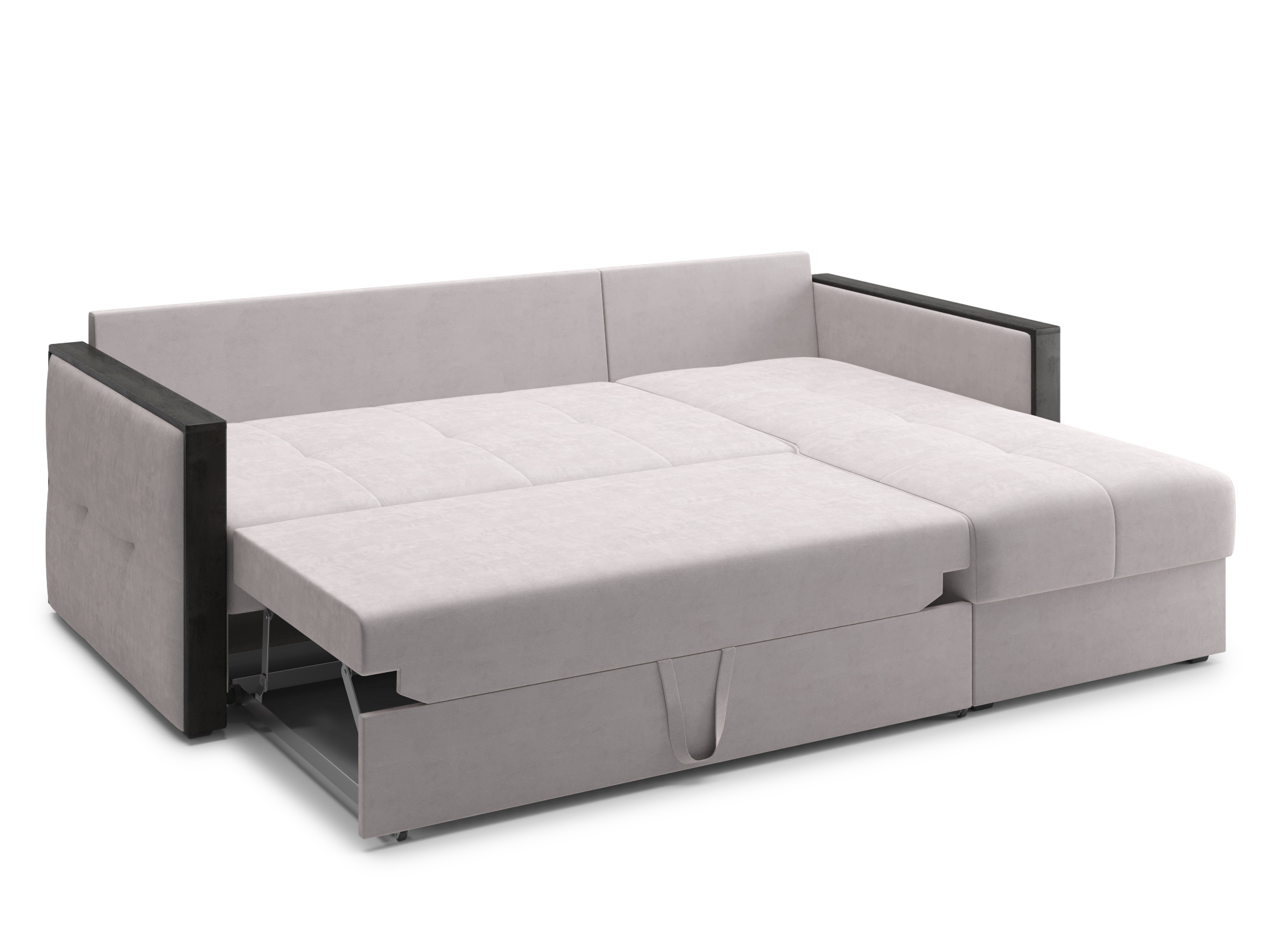 - Механизм раскладки дельфин — основан на выкатывании дополнительной платформы, скрытой под сидением дивана. Чтобы разложить диван, нужно потянуть за специальные ремешки, помогающие перемещать элементы конструкции. В результате этого действия нижняя часть дивана начнёт перемещаться. Делать это нужно до тех пор, пока часть не выдвинется максимально вперед. Затем следует немного приподнять элемент и упереть в противоположную часть, которая осталась неподвижной. Под сиденьем дивана находится короб для хранения вещей и постельных принадлежностей.