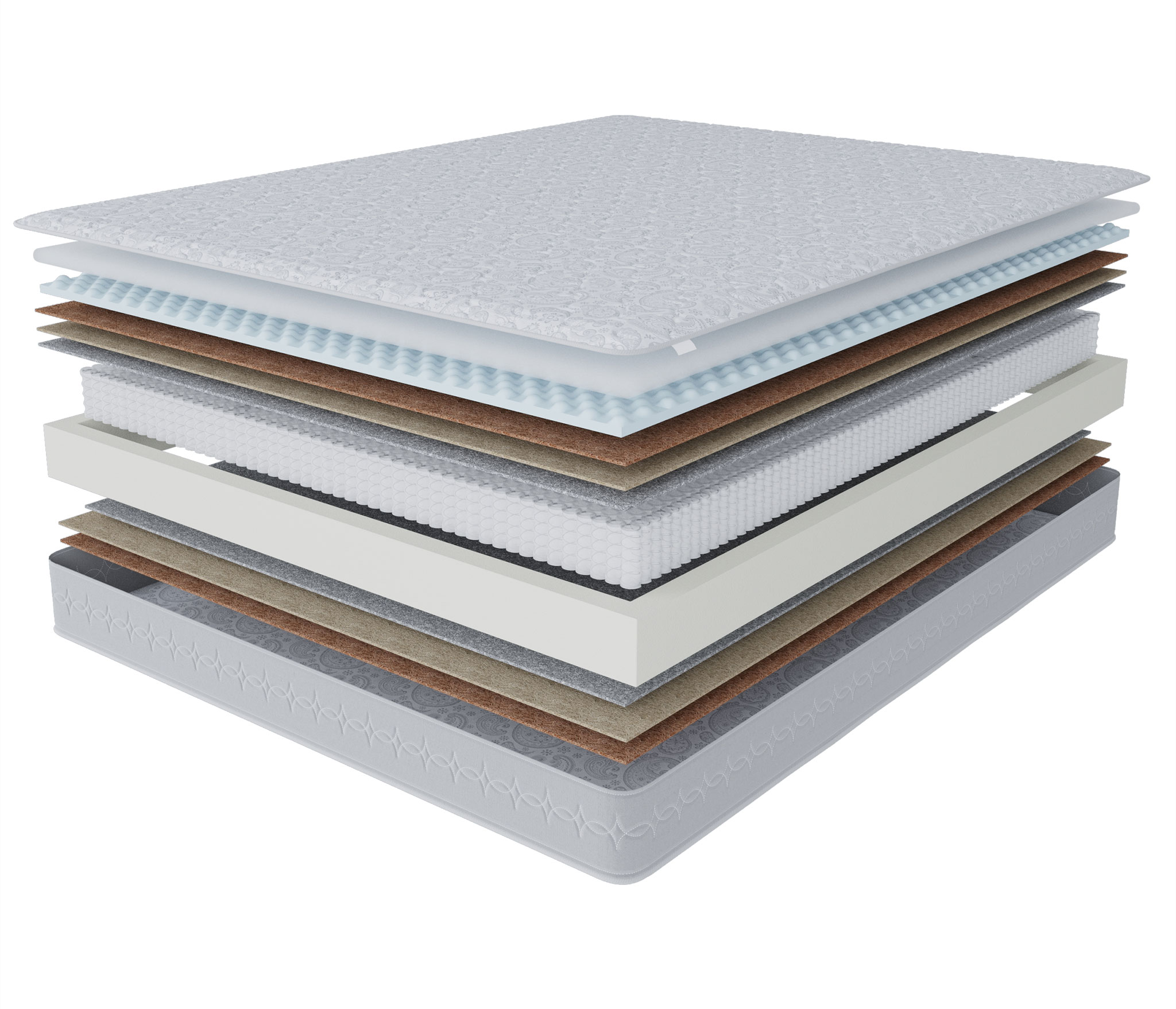 Наполнитель: вязкоэластичный ППУ, сизаль 10 мм, латексированная кокосовая плита 10 мм, термовойлок, латексированная кокосовая плита 20 мм, ячеистая пена с эффектом микромассажа.