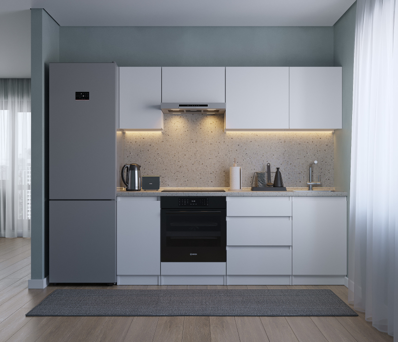 Кухня Леон сочетает в себе функциональность, стиль и доступность, и является прекрасным выбором для тех, кто ищет компактное и удобное решение для своей кухни. Кухонный гарнитур Леон идеально подходит для помещений с ограниченным пространством. Корпус и фасады выполнены из белого ЛДСП. Фасады столов и шкафов не имеют лицевой фурнитуры и открываются захватом за тыльный край фасада. Леон смотрится современно, а отсутствие ручек упрощает уход за поверхностью.
