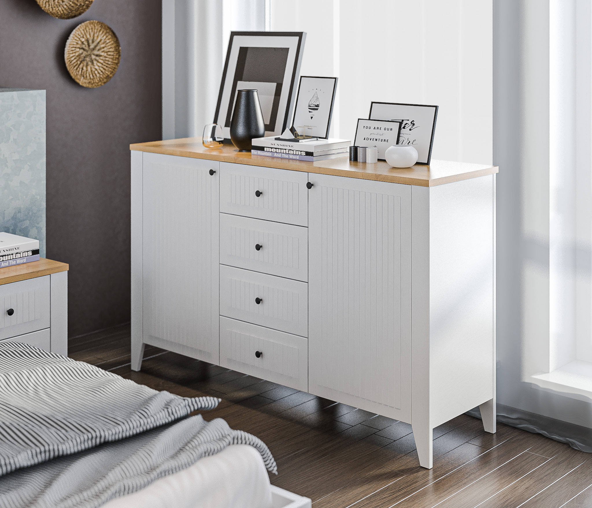Модульная система Монтана создана для ценителей стиля. Белый цвет мебели зрительно расширяет границы комнаты и делает интерьер светлее, а текстура дерева создает атмосферу уюта и близости к природе. Комбинируя элементы нашей новой модульной коллекции, вы сможете создать для себя неповторимый и комфортный интерьер.