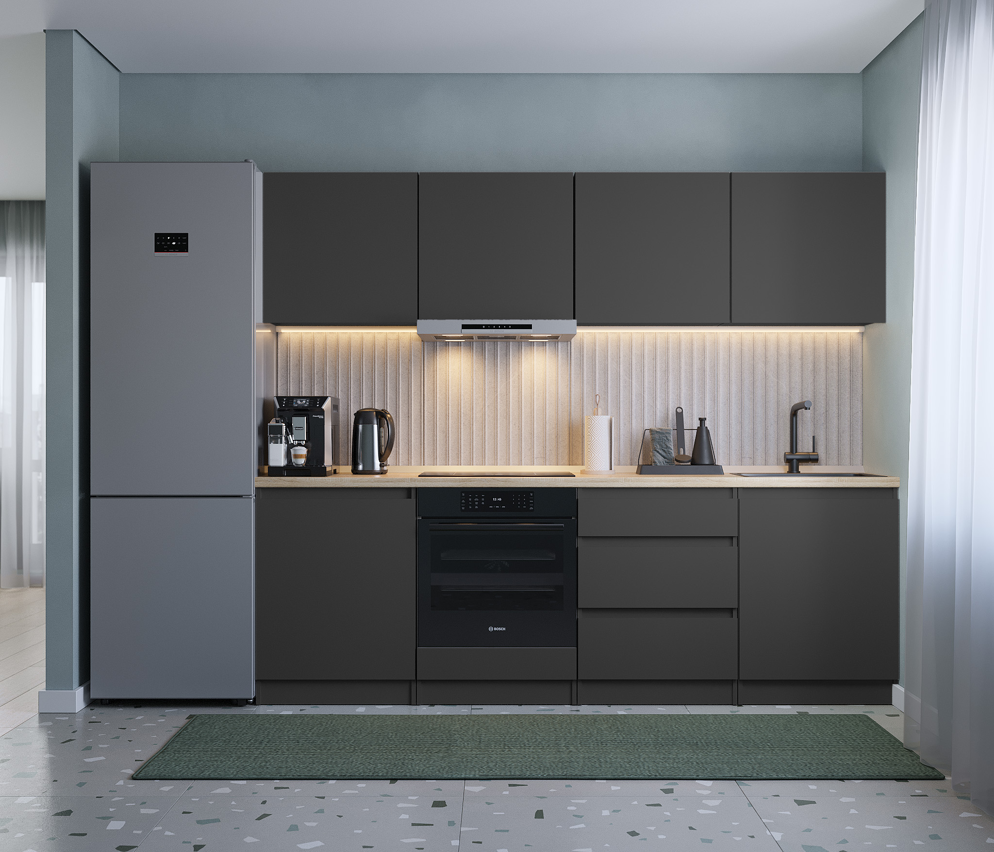 Обратите внимание, что столешница, стеновая панель, мойка и смеситель не входят в комплектацию кухни Леон и приобретаются отдельно. Это позволяет вам выбрать идеальные аксессуары и элементы для создания индивидуального дизайна вашей кухни.
