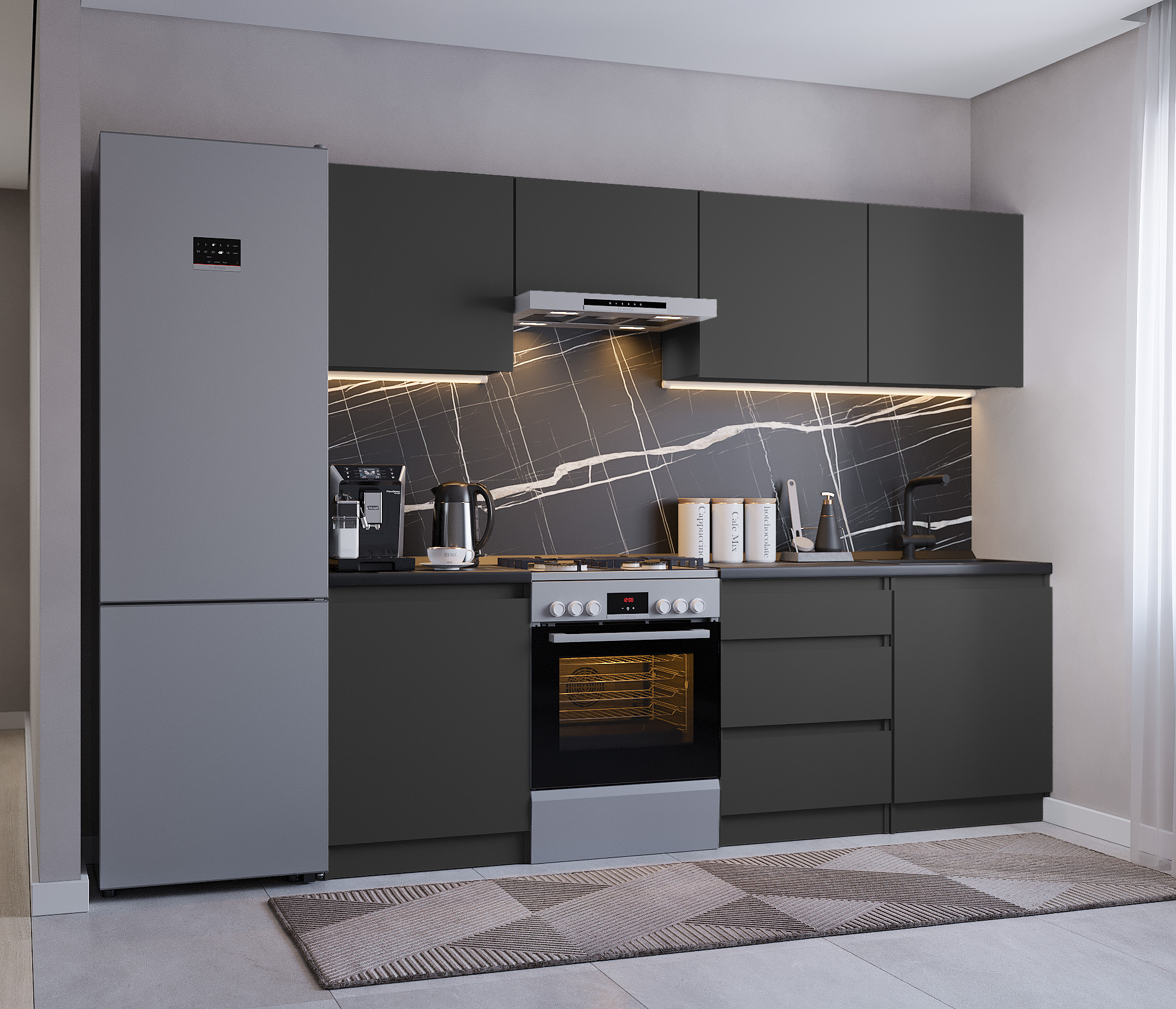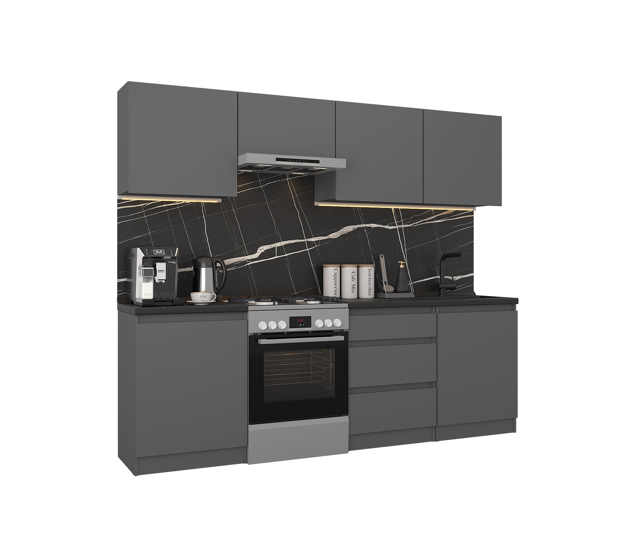 Обратите внимание, что столешница, стеновая панель, мойка и смеситель не входят в комплектацию кухни Леон и приобретаются отдельно. Это позволяет вам выбрать идеальные аксессуары и элементы для создания индивидуального дизайна вашей кухни.