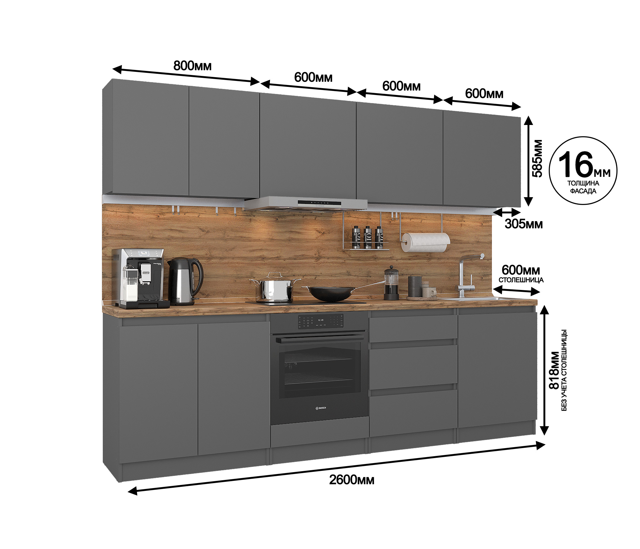 Длина кухни 2,6 метра она идеально подходит для помещений с ограниченным пространством.