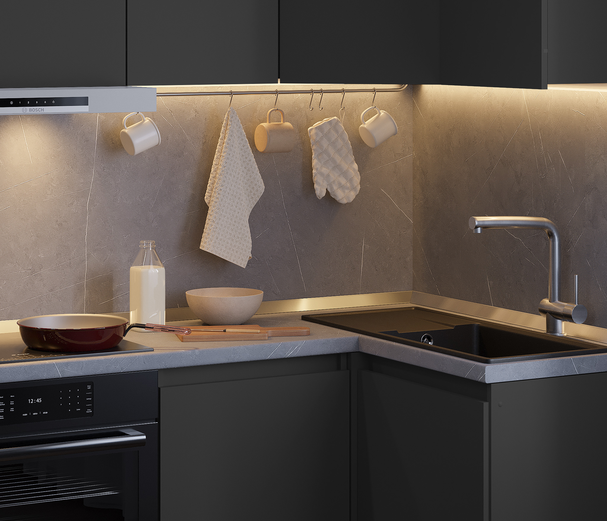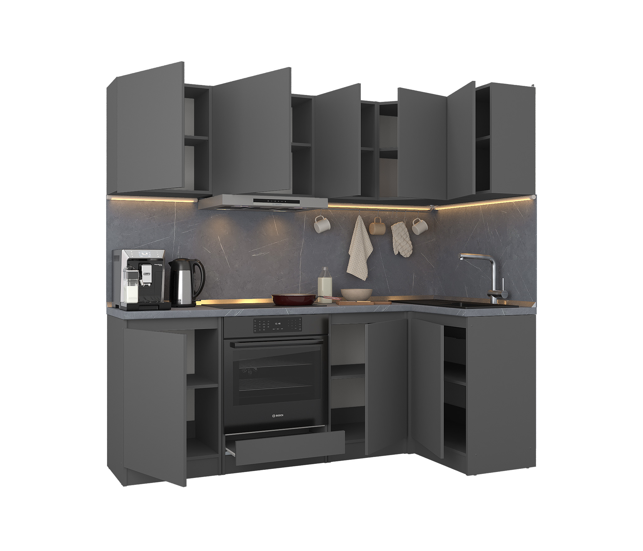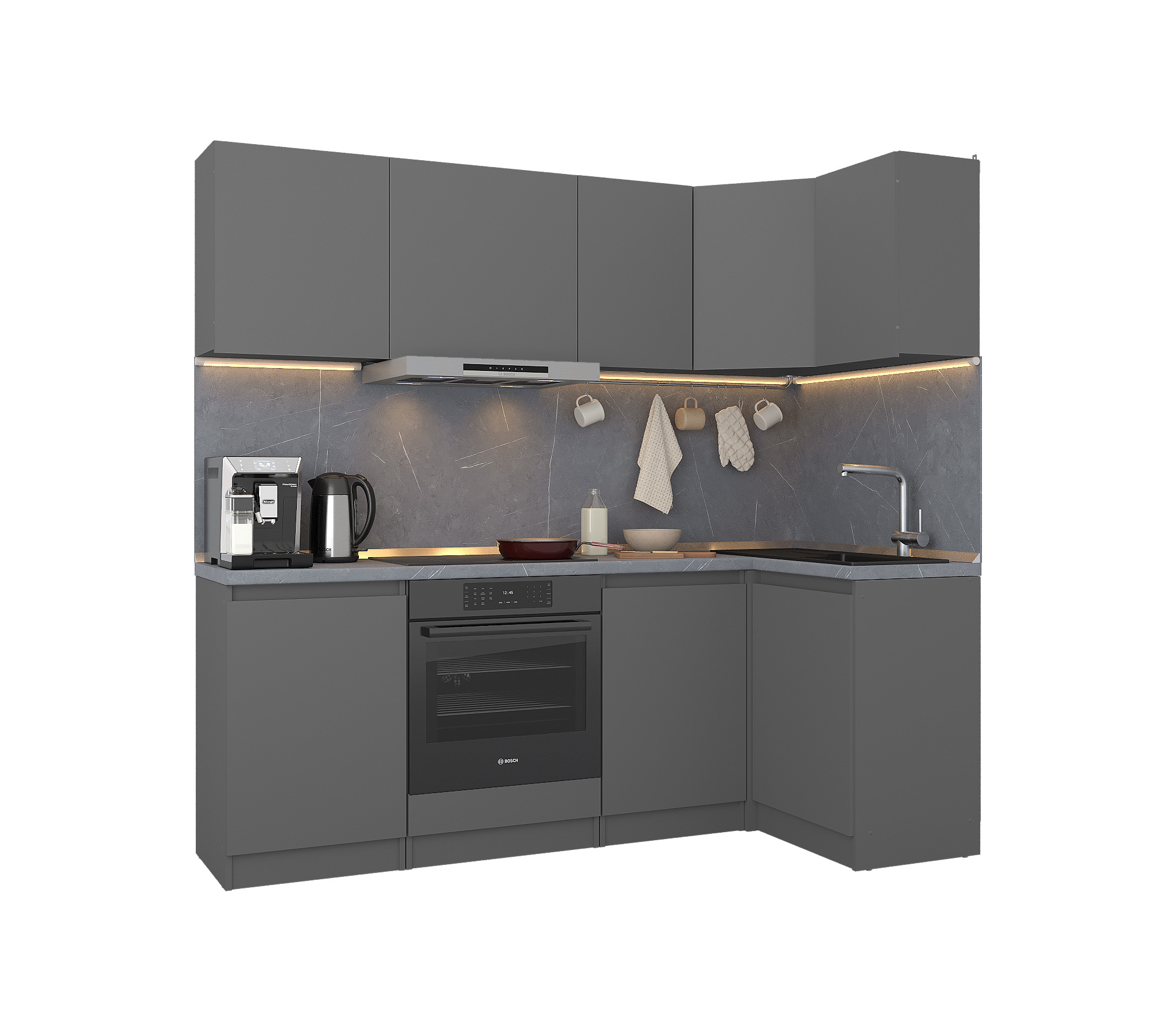 Обратите внимание, что столешница, стеновая панель, мойка и смеситель не входят в комплектацию кухни Леон и приобретаются отдельно. Это позволяет вам выбрать идеальные аксессуары и элементы для создания индивидуального дизайна вашей кухни.
