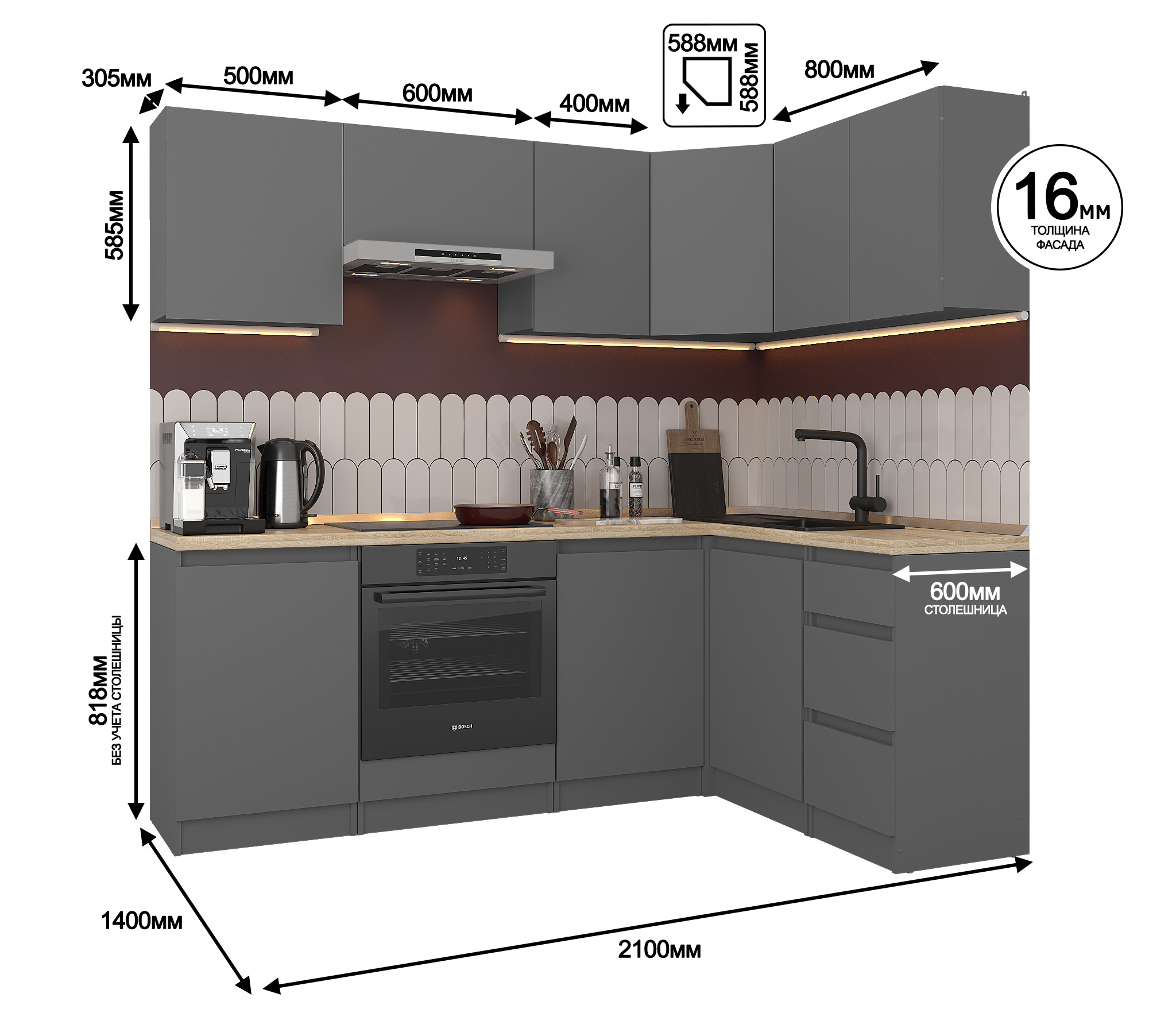 Размеры угловой кухни 2,1х1,4 м. она идеально подходит для помещений с ограниченным пространством.