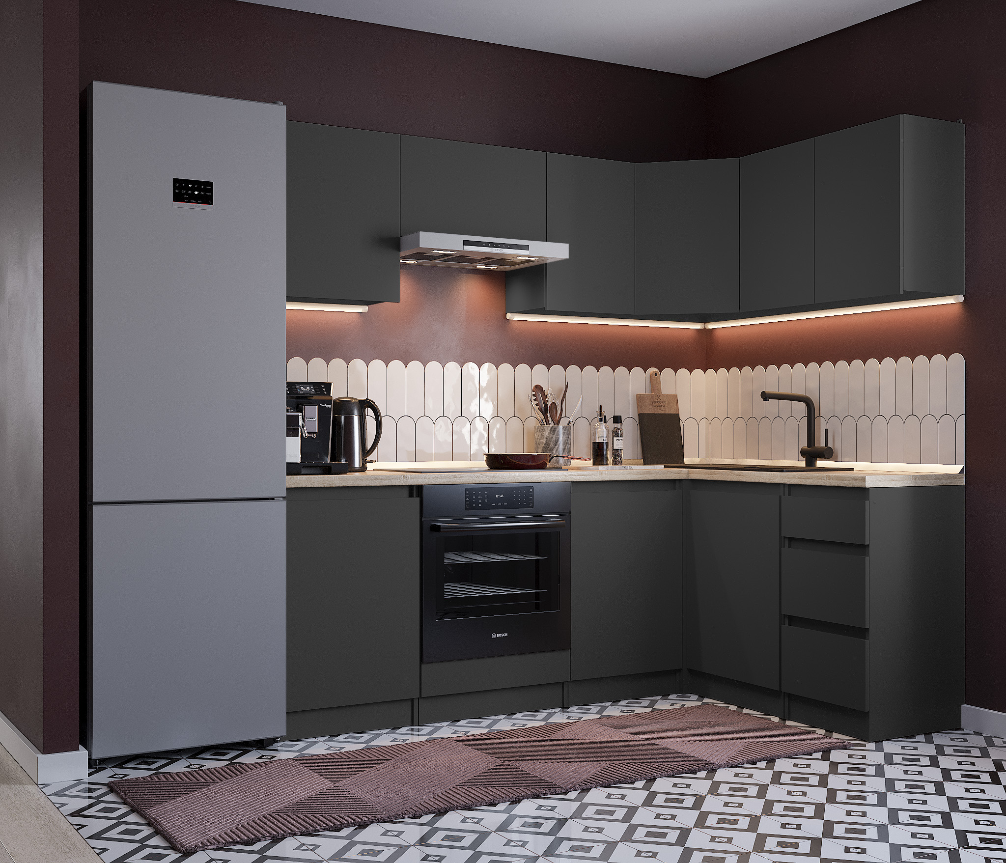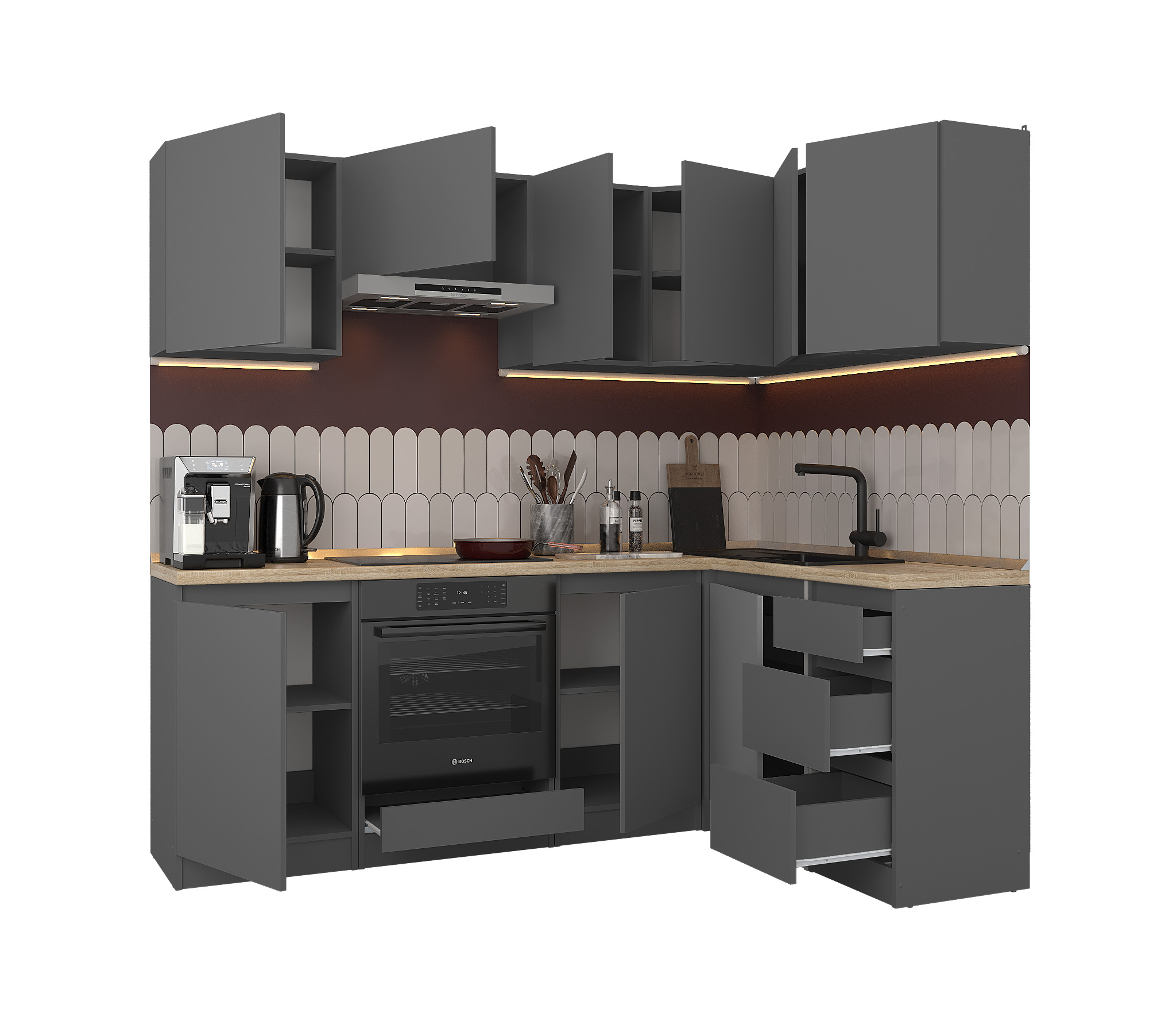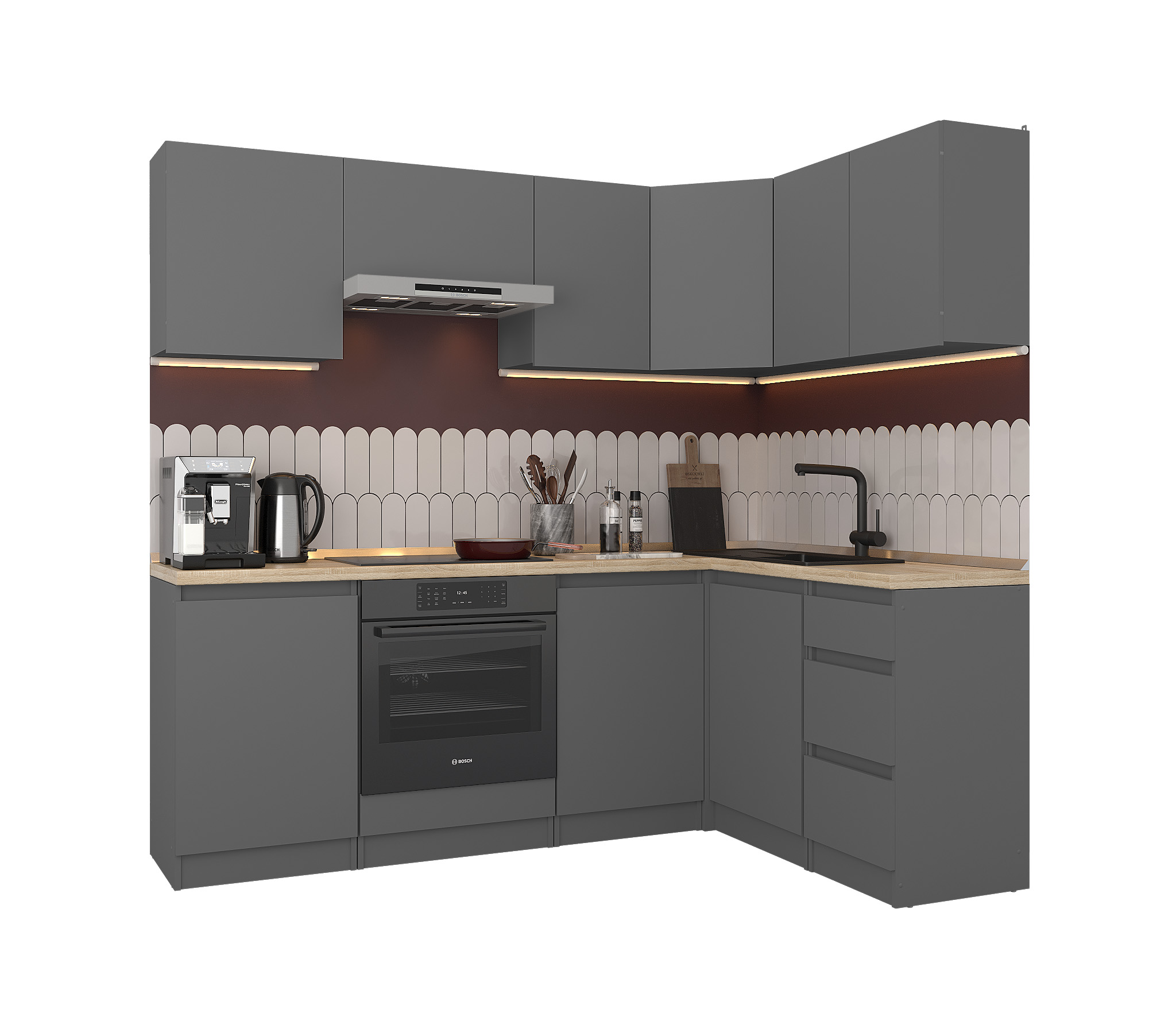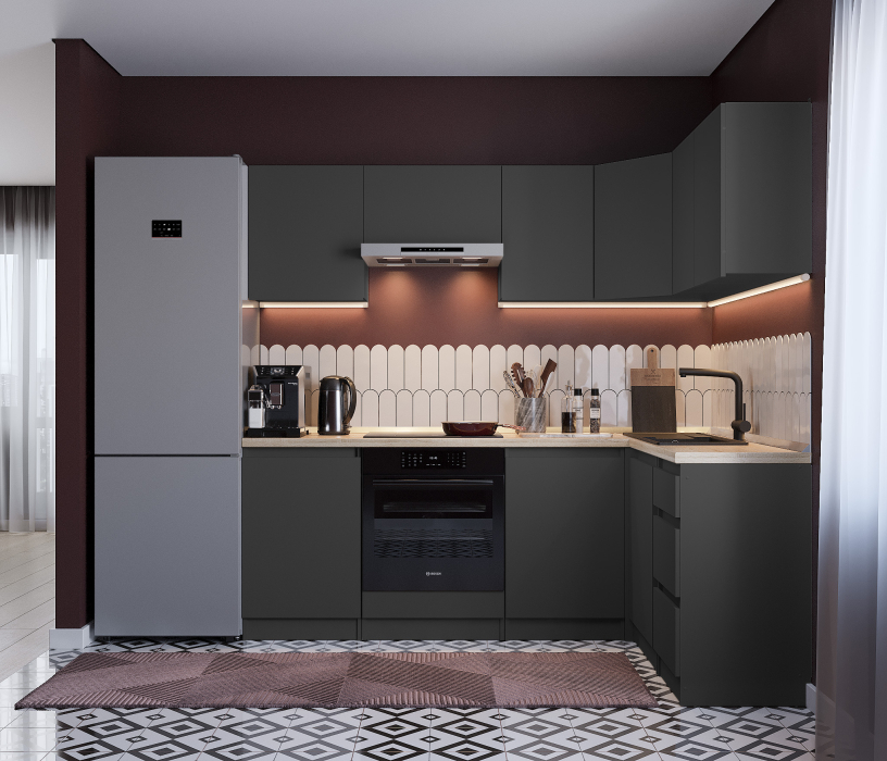 Обратите внимание, что столешница, стеновая панель, мойка и смеситель не входят в комплектацию кухни Леон и приобретаются отдельно. Это позволяет вам выбрать идеальные аксессуары и элементы для создания индивидуального дизайна вашей кухни.