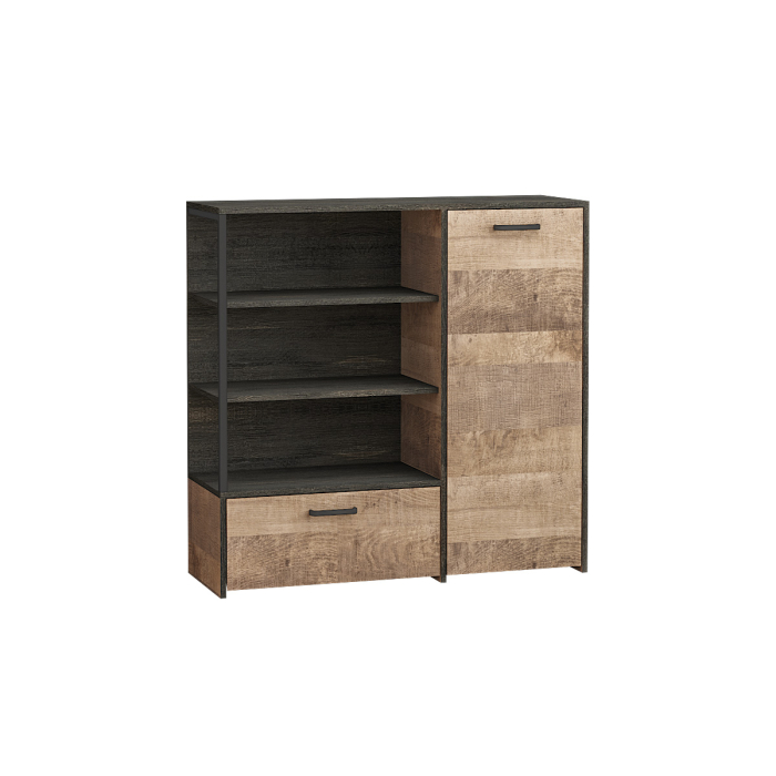 Лицевая фурнитура с тем же покрытием придаёт мебели индустриальную эстетику.