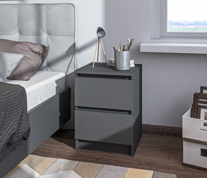Габаритные размеры тумбы довольно компактны - ширина 39 см, высота 53 см, глубина 39 см. Под столешницей расположены два ящика, оснащенных прочными выдвижными механизмами. Тумба идеально подойдет для оформления вашей спальни или детской в современном стиле. Тумба выполнена из прочного современного КДСП.
