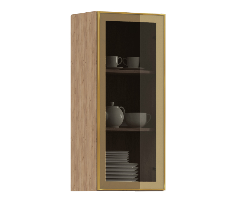 Комплект включает в себя корпус кухонной полки (цвета дуб вотан) с необходимой фурнитурой, фасад из алюминиевой рамки золотого цвета и бронзового стекла, а также ручку, соответствующую цвету рамки фасада.