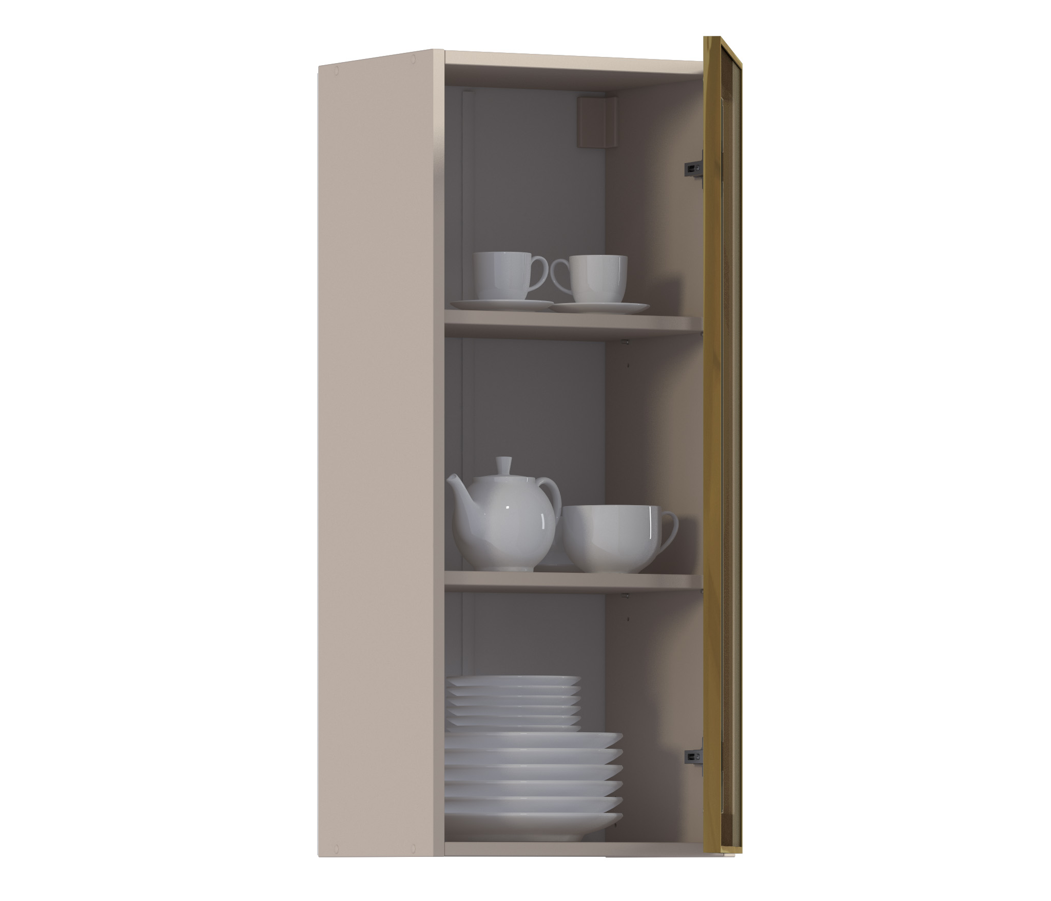 Комплект включает в себя корпус кухонной полки (песочного цвета) с необходимой фурнитурой, фасад из алюминиевой рамки золотого цвета и бронзового стекла, а также ручку, соответствующую цвету рамки фасада.