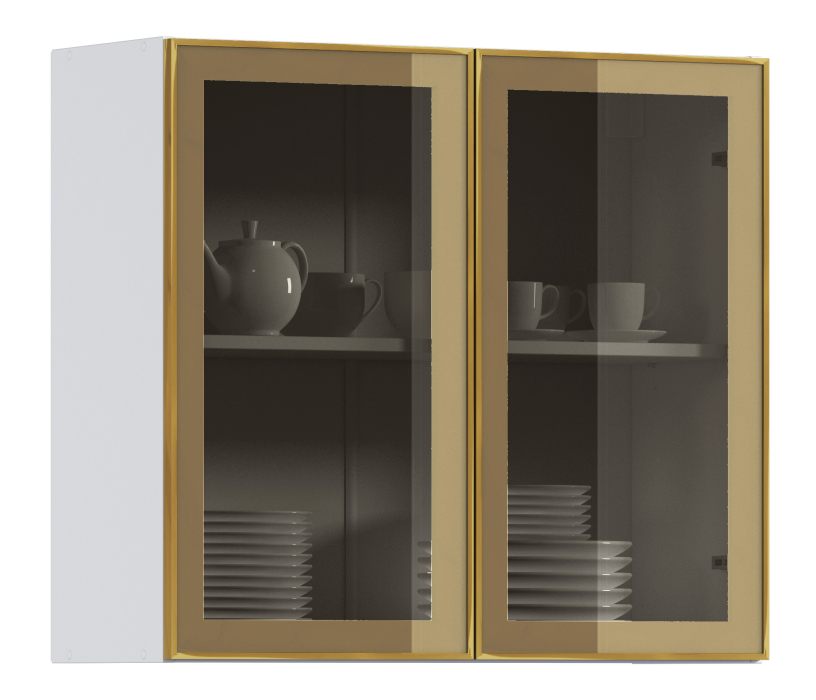 Комплект включает в себя корпус кухонной полки (белого цвета) с необходимой фурнитурой, фасад из алюминиевой рамки золотого цвета и бронзового стекла, а также ручку, соответствующую цвету рамки фасада.