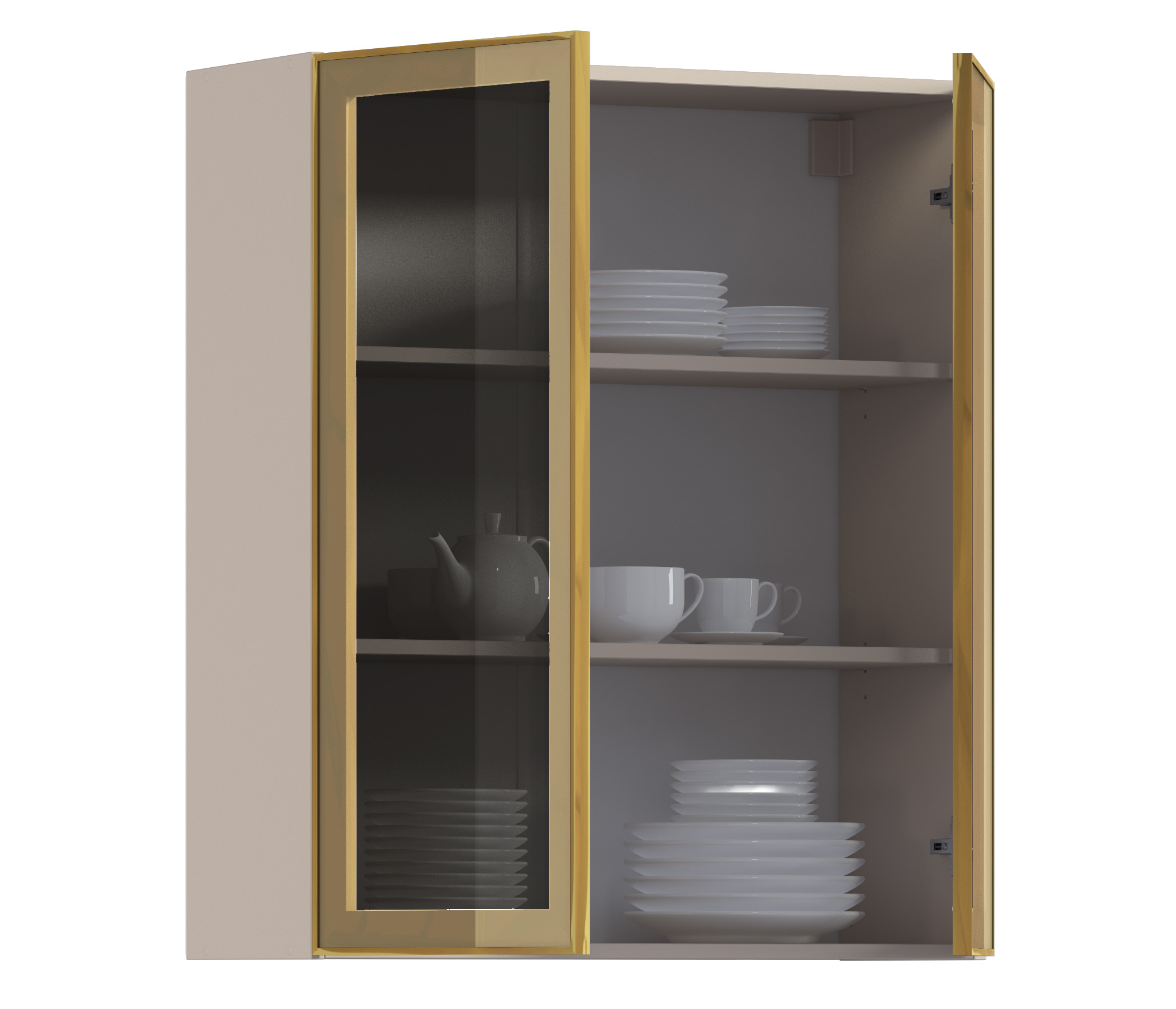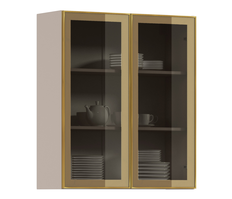 Комплект включает в себя корпус кухонной полки (песочного цвета) с необходимой фурнитурой, фасад из алюминиевой рамки золотого цвета и бронзового стекла, а также ручку, соответствующую цвету рамки фасада.
