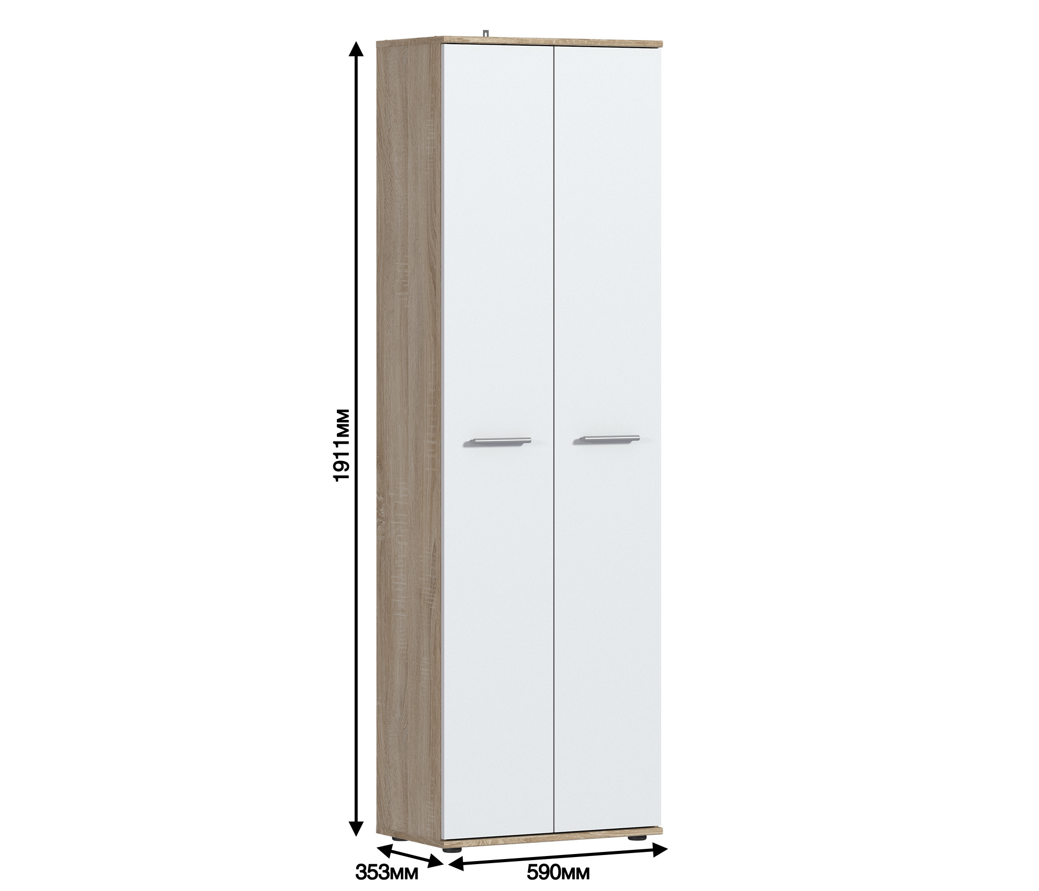 Выполнен шкаф из современного и качественного материала КДСП. Внешняя отделка комбинированная – корпус в цвете «Дуб Сонома», фасады чисто белые.