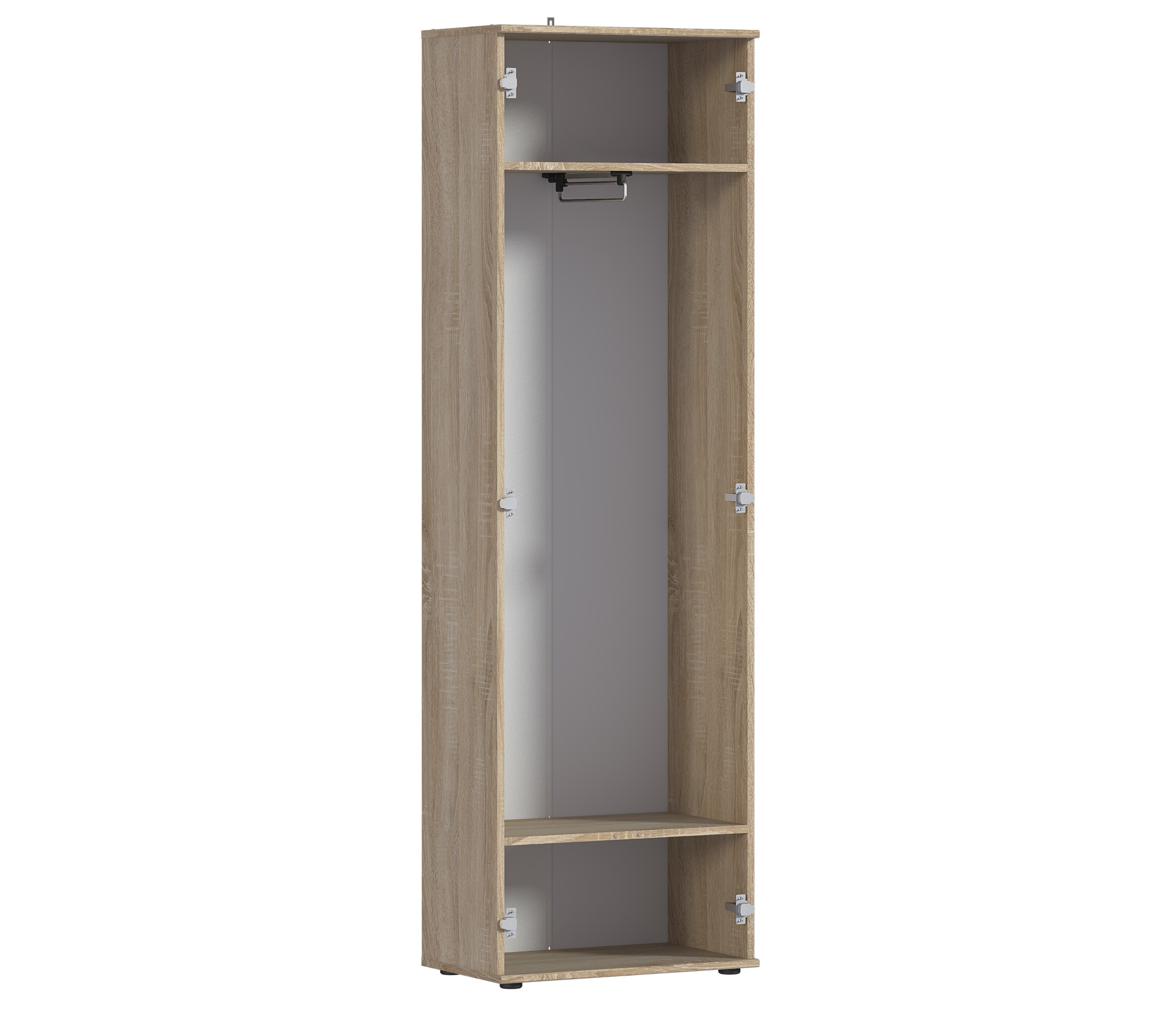 Шкаф имеет одно вместительное плательное отделение со штангой, над которым расположена антресоль. Также внизу расположено отделение для хранения обуви Габаритные размеры шкафа – ширина 59 см, высота 191 см и глубина 35 см.