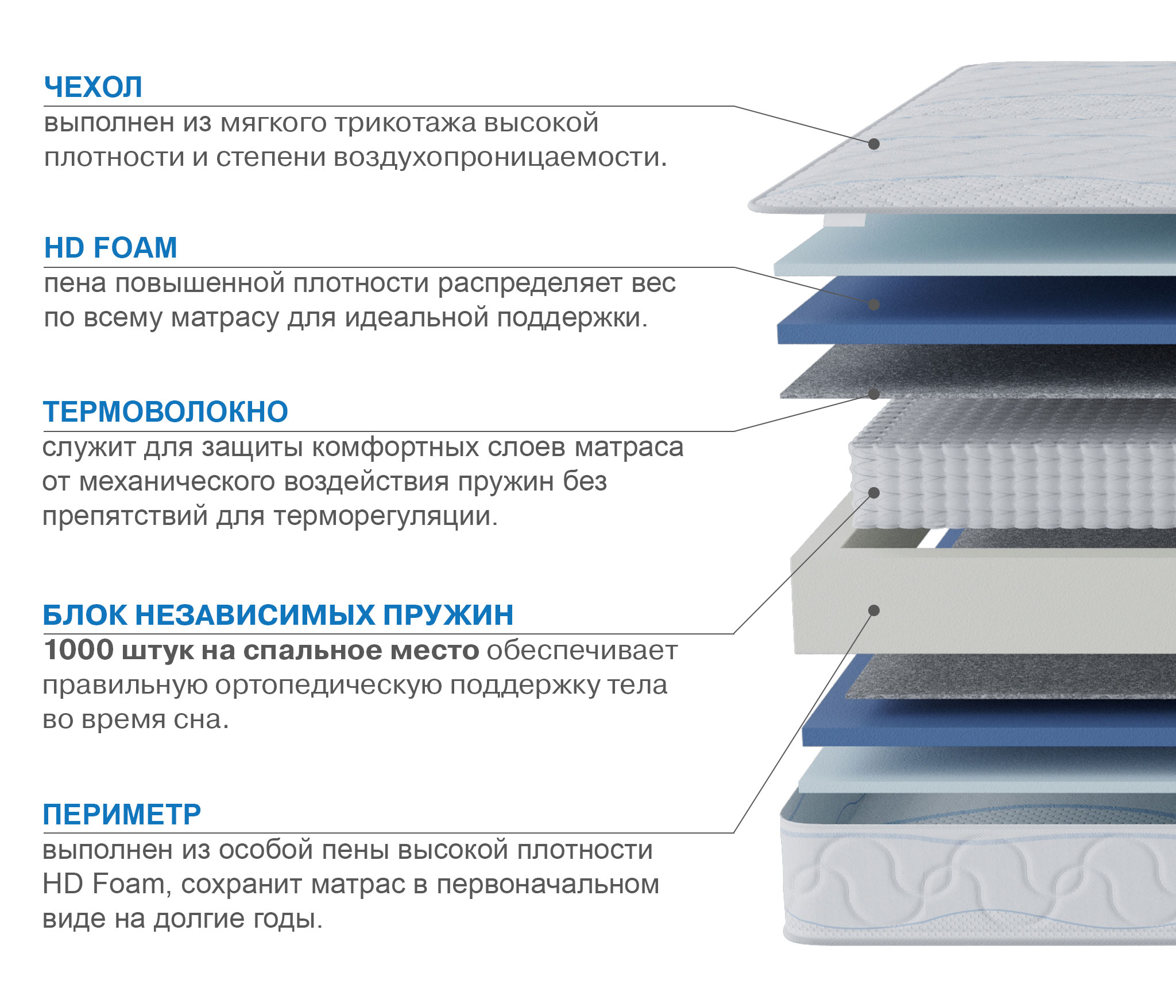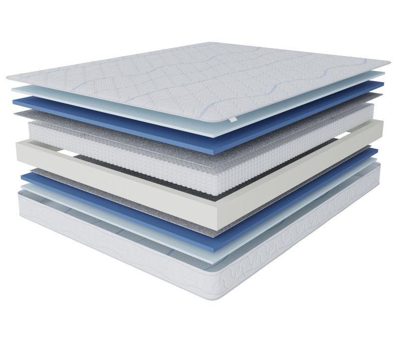 В основе матраса лежит блок независимых пружин (мультипакет) 500 пр/м2, благодаря такой плотности пружин, матрас может повторять контуры спящего с максимальной точностью и при этом выдерживать довольно высокие нагрузки. Термовойлок защищает комфортные слои от истирания и соприкосновения с пружинами. В качестве комфортного слоя используется самая жесткая и прочная пена из существующих - (HL4065) толщиной 3 см.