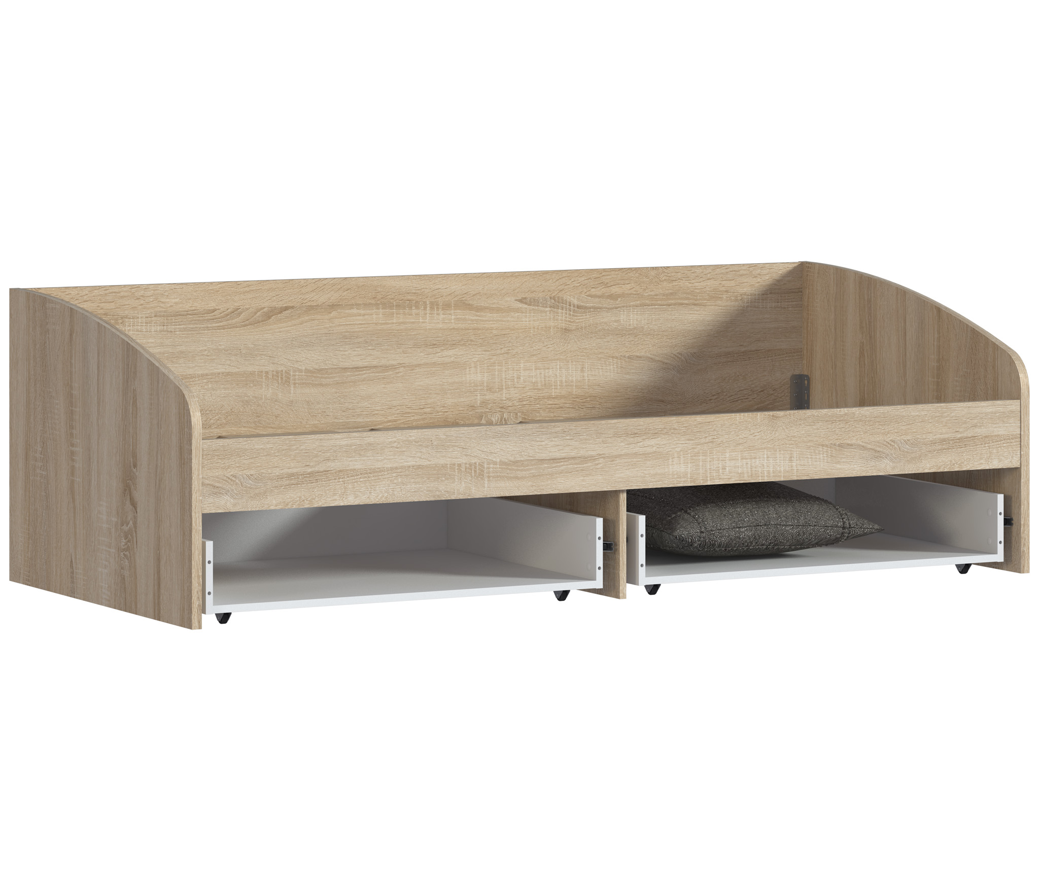 Кровать из детского гарнитура «Мамбо» – симпатичная и комфортабельная модель, воспользоваться которой могут даже взрослые члены семьи. Занимая не так уж и много места, она выделяется своей функциональной значимостью. Три в одном. Днем это вполне приличный диванчик, ночью полноценное спальное место шириной 95 см, к тому же, это и система хранения постельных принадлежностей, так как модель оборудована двумя объемными выдвигающимися ящиками. Кровать собрана из мебельных щитов повышенной прочности с износостойким поверхностным покрытием приятного пастельного оттенка «Дуб Сонома». Ящики и фасады к ним изготовлены из ДСП песочного цвета. Неброское сочетание цветов вносит в интерьер гармонию и умиротворение, что бывает нелишним, когда требуется успокоить разыгравшегося ребенка.