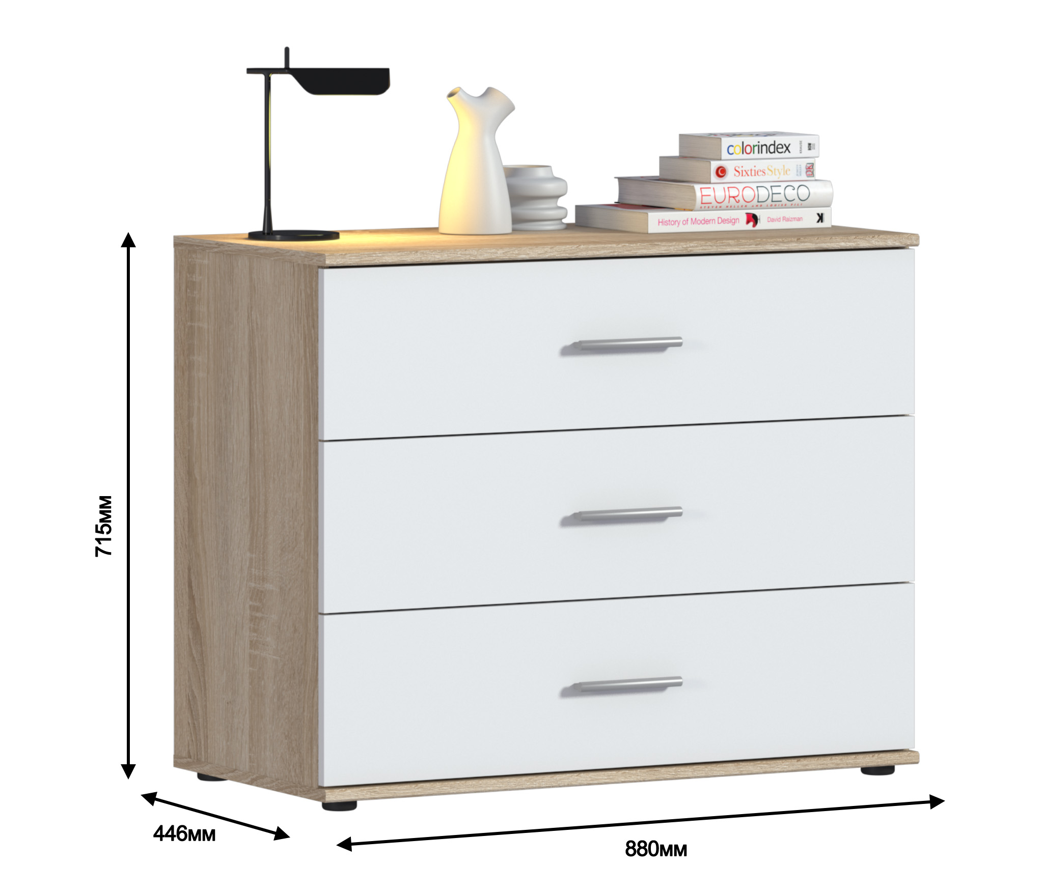 Комод Мамбо СБ-2540/1 – оптимальное решение вопроса хранения. Он будет хорошо смотреться в гостиной, прихожей, спальне или в кабинете. Комод Мамбо имеет довольно компактные габариты – ширина 88 см, высота 71 см и глубина 44 см. Однако его обладатели никогда не жаловались на вместительность. В трех больших выдвижных ящиках можно разместить множество нужных вещей. Выполнен комод Мамбо из современного материала.
