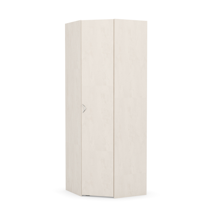 Угловой шкаф с распашной дверью на четырехшарнирных петлях. Лицевая фурнитура — металл, хром. Наполнение: полки и штанга. Максимальная нагрузка на полки — 4 кг.