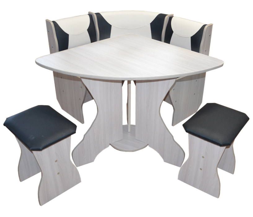 Кухонный уголок для маленькой кухни с удобными ящиками, которые расположены под сиденьями. Уголок является равносторонним. Размеры (Ш*Г*В) 970/970*500*800. Стол треугольный: 825x1150*735. Табурет 290x390x450. Материал: ЛДСП/к/з/ППУ. Цвет кожзама молочный/черный.