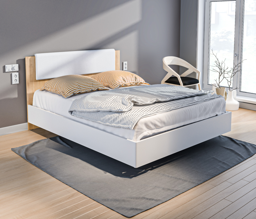 Двуспальная кровать имеет в изголовье мягкую накладку из качественной искусственной кожи.