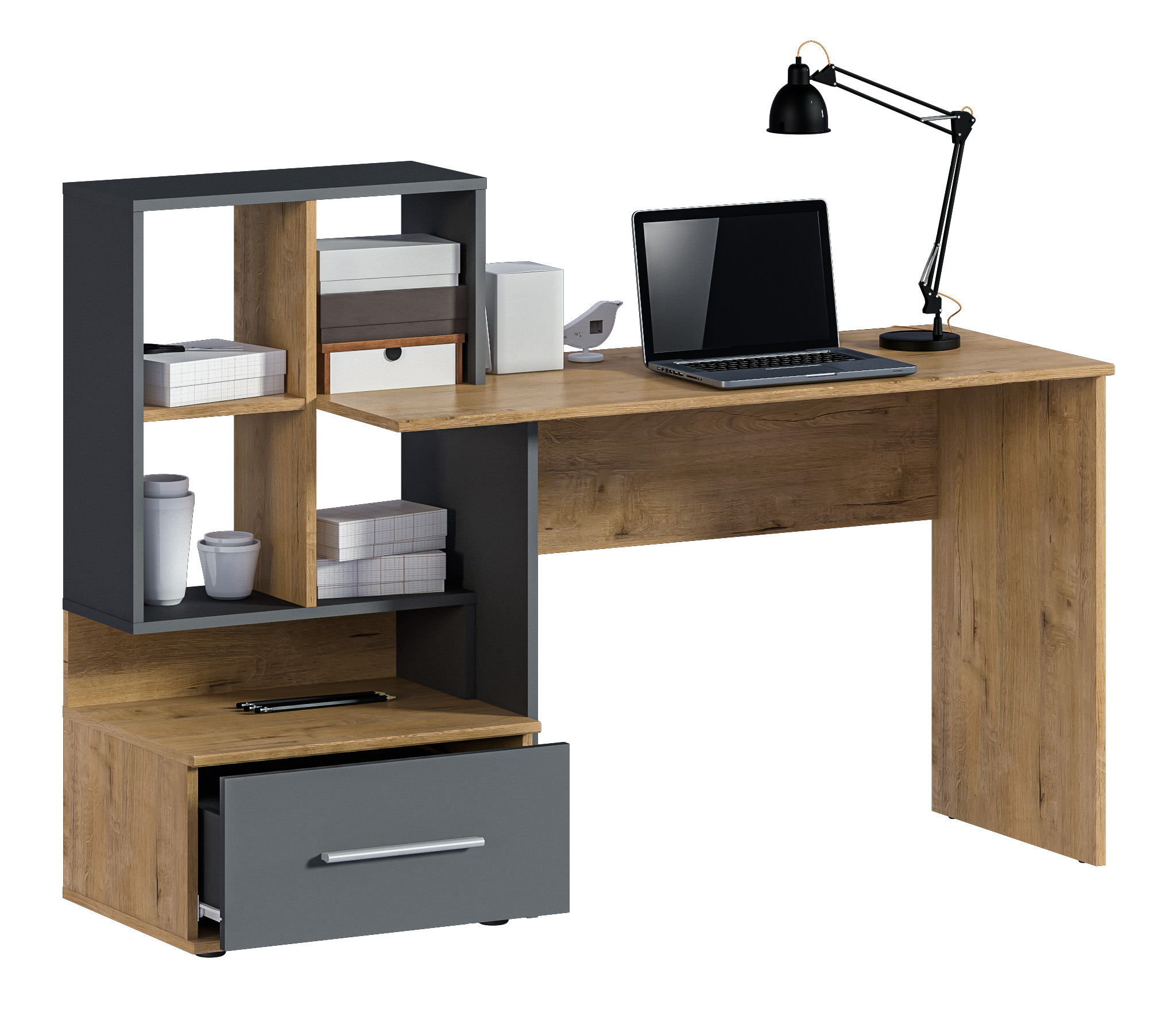 Стол Мамбо СБ-3339 – комфортное рабочее место, где предусмотрены отделения для хранения бумаг, книг, журналов. Он органично впишется в комнату школьника, студента, а также в кабинет. Габаритные размеры стола довольно просторные – ширина 148 см, высота 105 см и глубина 50 см. Рядом с рабочей поверхностью расположено вместительное отделение с полками и с ящиком.