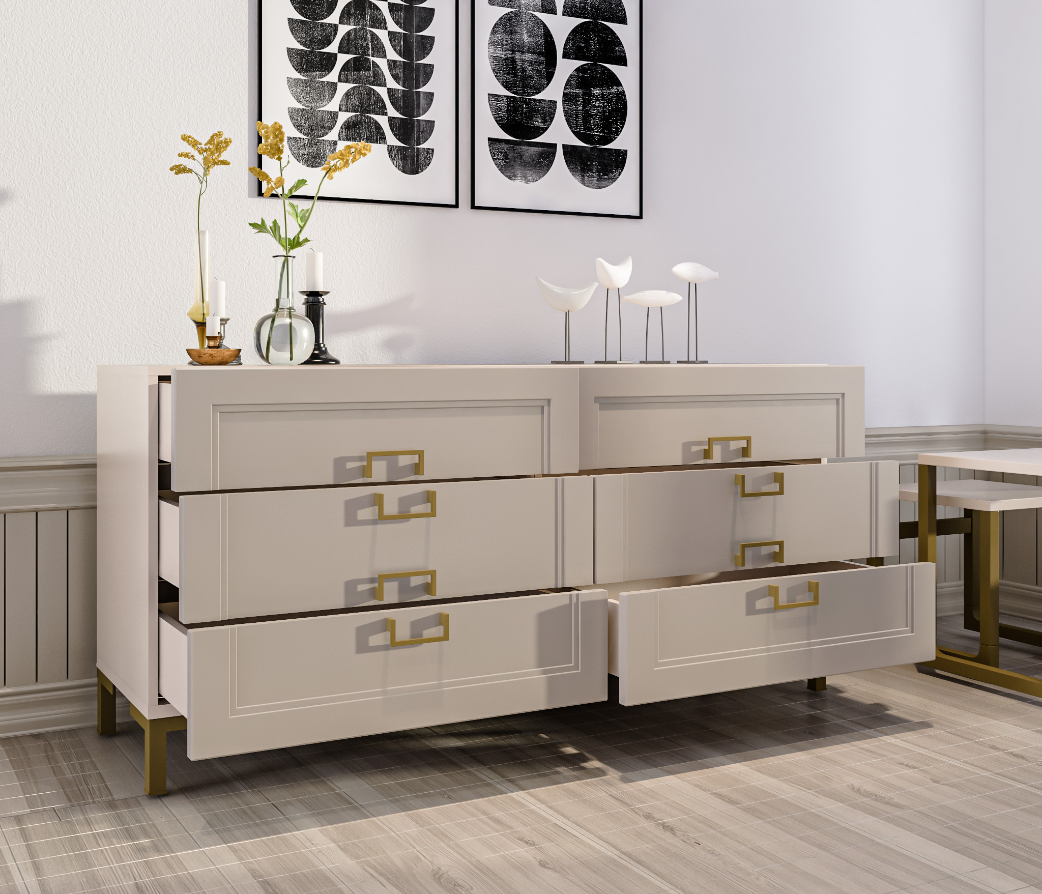 Золотистые ручки и ножки коллекции "Ассоль" добавляют неповторимый шик и изысканность, завершая образ тонким и стильным блеском. Эти акценты создают атмосферу роскоши и утонченности. Они играют роль визуального украшения, дополняя общий вид мебели и придавая ей особый шарм и элегантность.